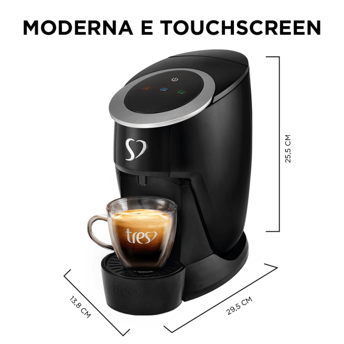 A Cafeteira de Espresso e Multibebidas Automática Touch TRES 3 Corações é moderna, elegante, compacta e touchscreen. Com um Design moderno e elegante, valoriza qualquer ambiente da sua casa, principalmente o cantinho do café. O destaque fica por conta do painel touchscreen, novidade neste modelo, cujos comandos são sensíveis ao toque. Além disso, a TOUCH é silenciosa, possui um compartimento interno para até 4 cápsulas usadas e sistema multipressão.