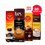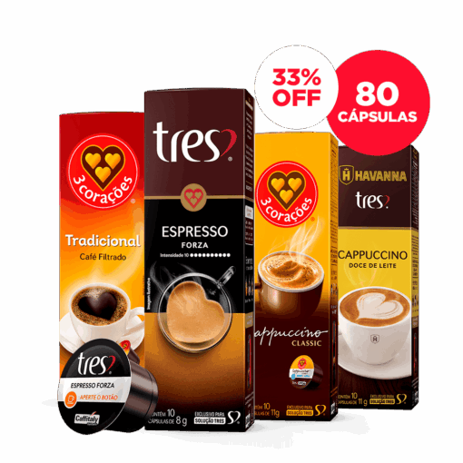 O Kit Os Queridinhos 80 Cápsulas TRES 3 Corações é um combo perfeito para quem ama cafés e bebidas cremosas. Escolhemos as cápsulas TRES 3 Corações mais vendidas para você degustar. Aproveite essa oferta exclusiva Mercafé! Contém 80 CÁPSULAS (8 caixas com 10 cápsulas cada) dos seguintes sabores: 1 Cartucho de Cápsula de Cappuccino Classic TRES 3 Corações 1 Cartucho de Cápsula de Café Espresso Forza TRES 3 Corações 1 Cartucho de Cápsula de Café Espresso Vibrante TRES 3 Corações 1 Cartucho de Cápsula de Cappuccino Doce de Leite Havanna TRES 1 Cartucho de Cápsula Chocolatto TRES 3 Corações 1 Cartucho de Cápsula de Café Espresso Atento TRES 3 Corações 1 Cartucho de Cápsula de Café Filtrado TRES 3 Corações 1 Cartucho de Cápsula Baileys Supremo Macchiato TRES *Para uso exclusivo no sistema TRES®